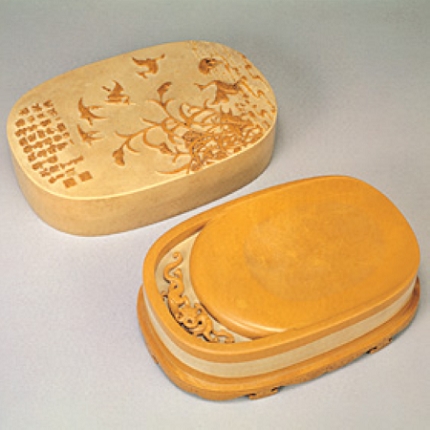 乾隆的蟠璃砚,黄色的砚面与座,色彩抢眼,盒面的泸州白鹭图将绘画融入工艺之中。