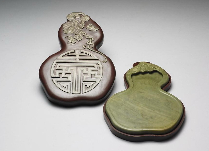 雍正的葫芦砚,葫芦造型婉转,砚首蝙蝠俯身下探砚池,有福寿的吉祥意涵又不失雅意。
