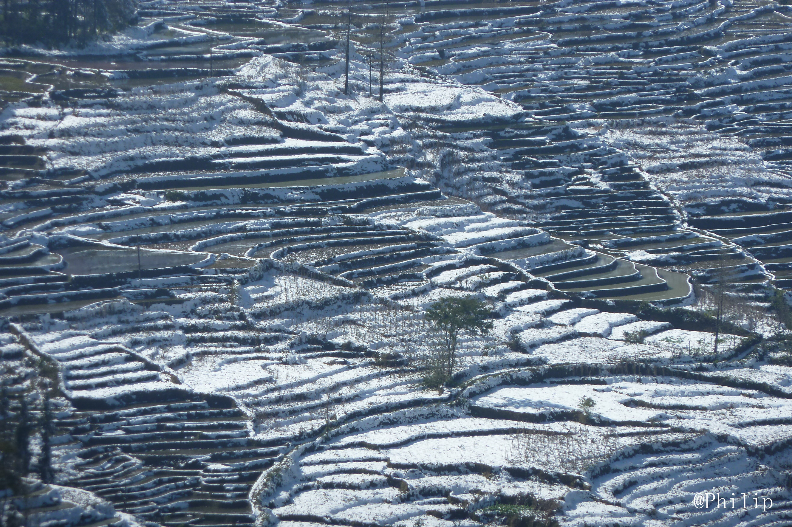 正好赶上云南全境(除版纳地区外)普降大雪,元阳梯田的雪景让我赶上了。 虽然所住胜村青旅断电缺吃,晚上要盖2床棉被才刚御寒,还是值了。 行程从难到易,在元阳大雪的第二天早晨,能见度极差,就差半小时准备离开。 天光放晴,太阳显露,一时间,雾散景现。 就一霎那的光景,心脏小激动了一下。 梯田雪景自带一股仙气,傍晚青旅的二掌柜亲做导游,带到一处山坡等日落。 直到今天还念念不忘在那个小山坡,暖暖的阳光洒在身上,躺在稀疏的草地,闭上眼睛,感受清风的拂面。 什么都不用看,又什么都感受得到。 觉得不远万里来,就为了这段小憩。 美好的时光…