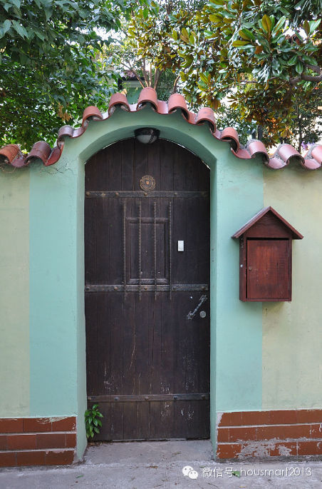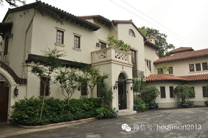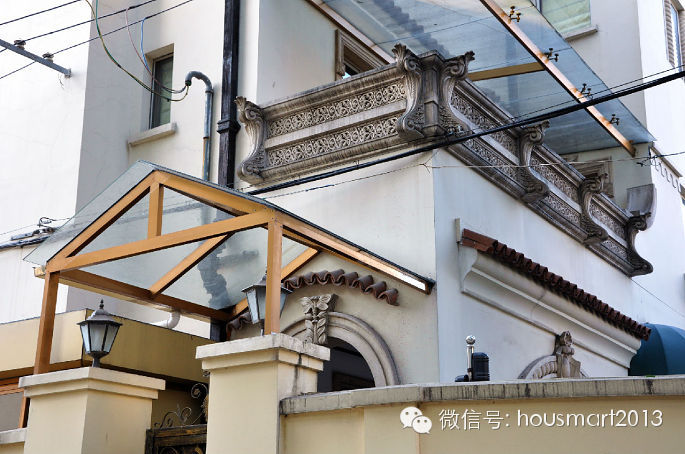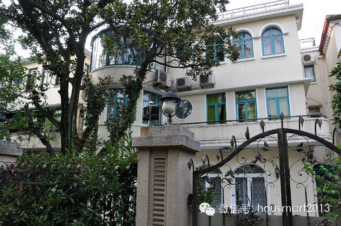 模 范邨西面隔壁的弄堂就是前面已经介绍过的文化名人邨—四明邨;而靠西紧挨着四明邨的延安中路955弄门前也挂着“优秀历史建筑”的牌牌。这里的住宅建于 1931年,砖木结构,按铭牌介绍是西班牙式花园住宅,四坡顶、文化石墙面、入口和阳台外廊处的古典柱饰等还是透露出了西班牙建筑元素,但和我先前看到的 西班牙风格建筑屋面多用筒瓦不同,这里用的是机制瓦。
