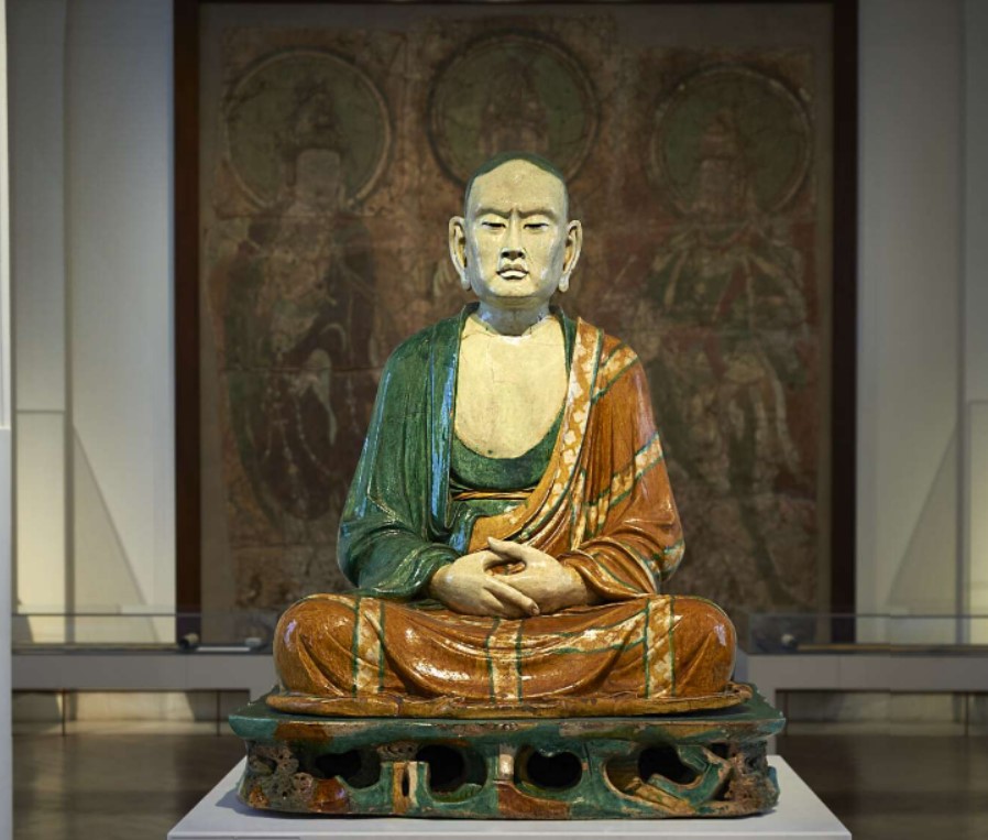 现藏于大英博物馆的辽三彩罗汉像。双手结禅定印,形象鲜活,惟妙惟肖。极为罕见的写实主义。眉头微蹙,是为众生疾苦而愁,平添无尽的想象